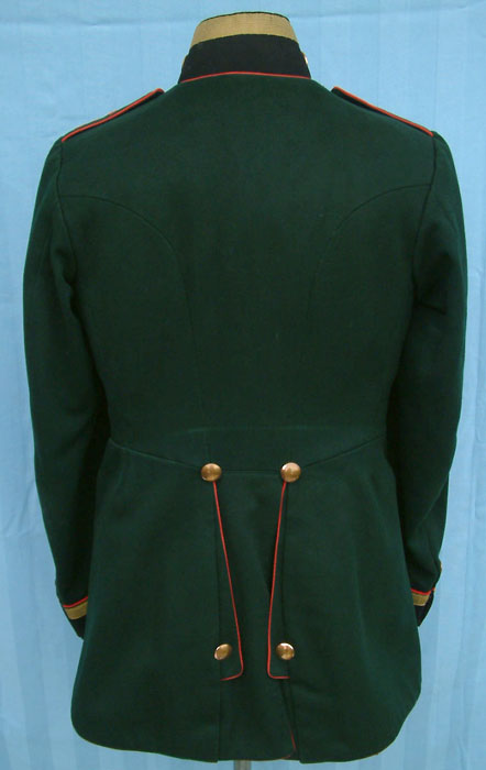 | The back of the Waffenrock showing the piping arrangement on the rear skirt. Sachsen (Saxon) Waffenrock had a unique pattern of rear skirt with reduced buttons and straight piping. The bottom edge of all Sachsen Waffenrock are piped. |