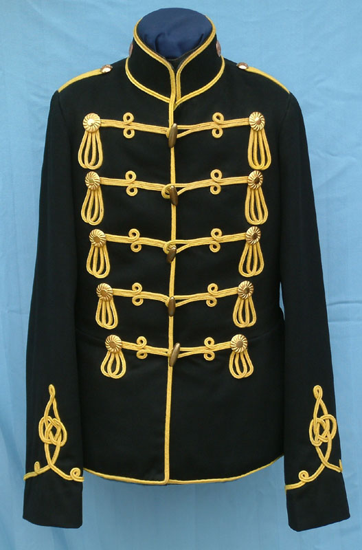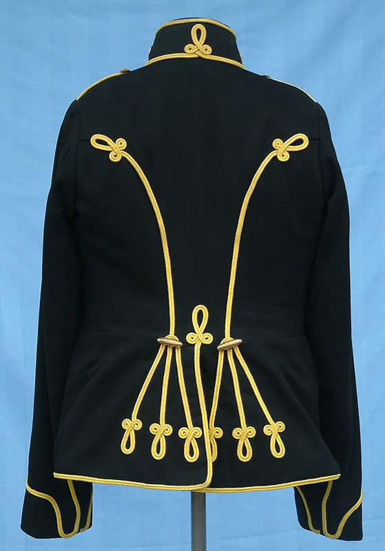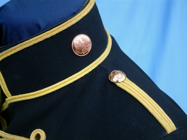 | A close up of the shoulder and collar showing gilt toggles for securing the front and the bright gilt rosettes. | ||