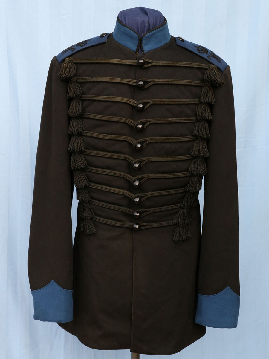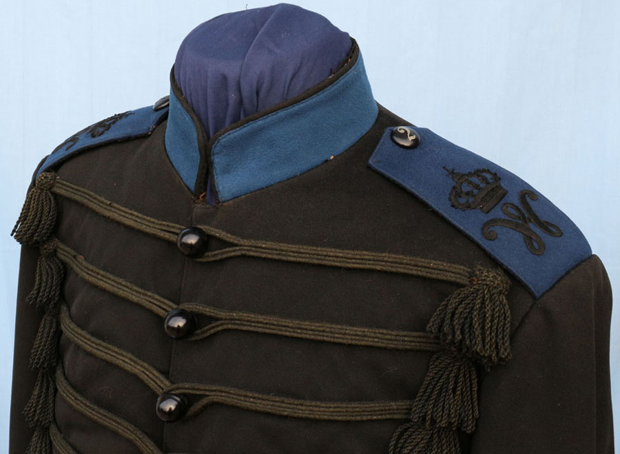 | The Polrock is highly distinctive not only because it is black wool with cornflower blue cuffs, shoulder straps and black-piped collar, but the cuffs are Polish (like Ulanen) and the front is braided (like Husaren). However, the oddest feature are the wool tassels at each end of the chest braid. The braiding and tassels at one time would have been jet black, but they have faded with age. All buttons are glass (yes glass) except the shoulder buttons which are painted zinc. The lack of NCO sleeve chevrons identify the original owner as having been a Füsilier (Private). The rank insignia on the Polrock for NCO's was also unique in the Imperial Army, in that it was British.So in the British Army pattern, NCOs carried silver chevrons on the right sleeve : two for Unteroffizier, three for Sergeant, and four for Feldwebel. |