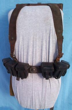 | A view of the right side of the equipment. The water bottle is worn clipped to the Haversack. The Haversack was used for holding a soldiers personal possessions, such as feldmütze (cap), rations, eating utensils etc. | |