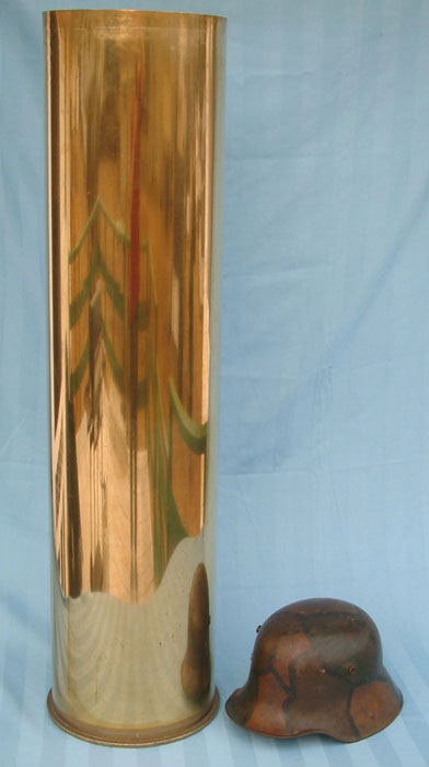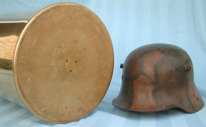 | The base of the 24cm Kanone casing shown with a Model 1916 Stahlhelm to illustrate the size.The base measures 27.5 cm (11 inches) across. The first cartridge cases used for the 24cm Kanone were of naval origin as these superb Krupp manufactured guns were originally mounted in turrets on the obsolete Wittelsbach Class Battleships. These Imperial German naval casings had an "M" with a crown above it and the month of production in Roman numerals. Army casings are marked with the month (January etc) and the flaming bomb of the Fußartillerie (Foot Artillery). |