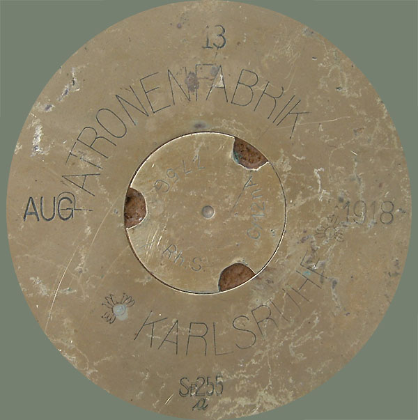 | A close-up of the head stamping on the base. Marked: PATRONENFABRIK (cartridge factory) KARLSRUHE and the dates of " AUG 1918".