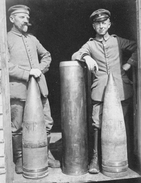 | A soldier and an NCO pose on a railway car with two high-explosive projectiles and a casing for the 24cm Eisenbahngeschütze.