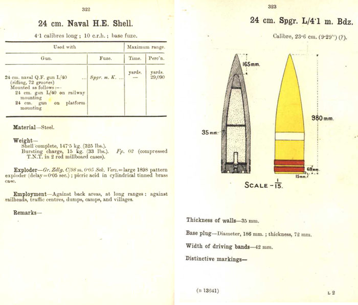 | The 24cm Kanone round at 147.5 kg (325 lbs.) according to a 1st war United States intelligence book, was rated at a maximum range of 26.6 km (29,090 yards). |
