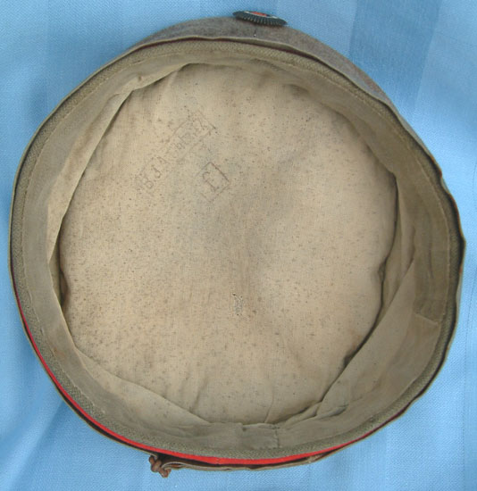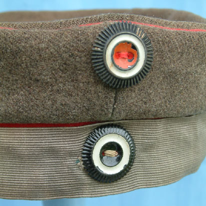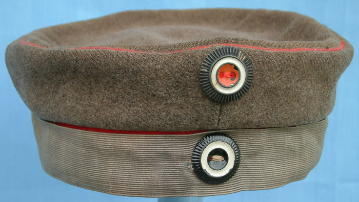 | Model 1910 Preußen Infantry Mannschaften (Other Ranks) Krätzchen with removable issue grey cloth strap over the red band. Note that the owner of the cap made a slit in the front of the band, so that the Mannschaften Preußen Kokarde would be visible. This is a late war cap and is made from a poor quality Feldgrau material which has a grey/brown color. | ||