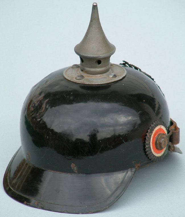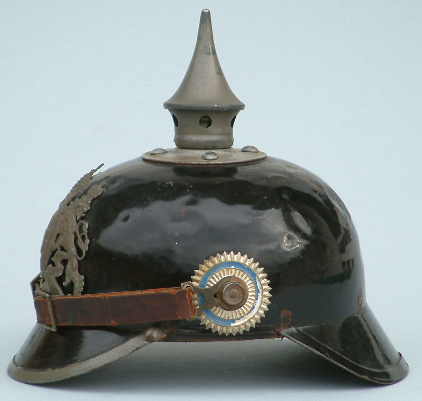 | This pattern of Eisenblech Ersatz-Helme is similar to the helmets contracted in 1914 by Bing A.G. and closely resembles the pre-war Pickelhaube. Unlike the Preußen version, the Bing helmet is pressed from one piece of metal. The Wappen (front plate), spike, base, side M91 posts, front visor, and studs on the front visor are identical to those used on the leather Pickelhaube. The liner is similar to a standard leather Pickelhaube, but attached to the shell with split brads with an additional felt strip for comfort between the liner and the helmet shell. There is no rear spine on this pattern of helmet. The Wappen (front plate) and removable spike are identical to the Model 1915 spiked helmets. This example refutes the theory that the Bayern Eisenblech (tin) Pickelhaube were only produced with gilt fittings. | ||