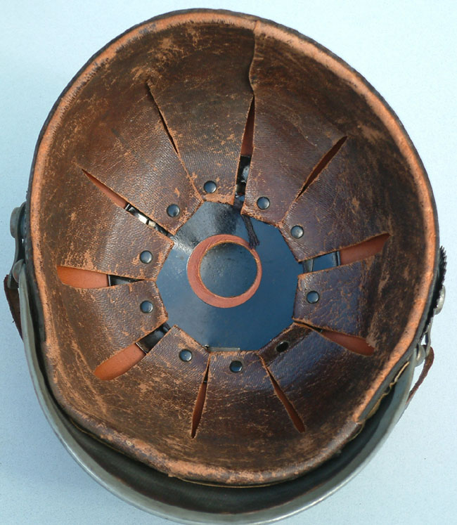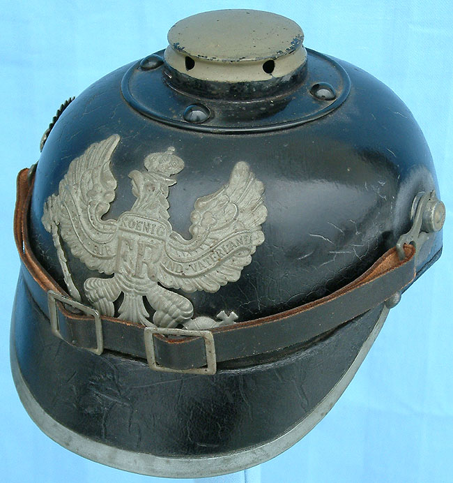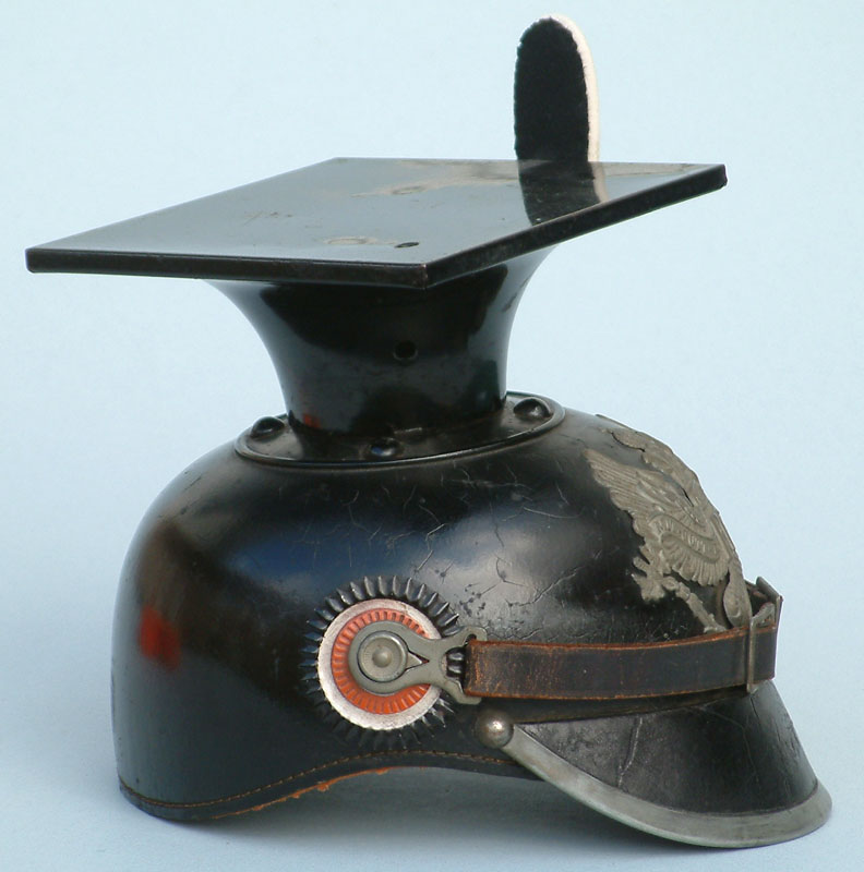 | Model 1915 Preußen Mannschaften (Other Ranks) Ulanen Tschapka. This helmet has the removable tin top introduced in 1915. Ulanen helmets followed the 1915 regulations and utilized grey oxidized steel fittings. | ||