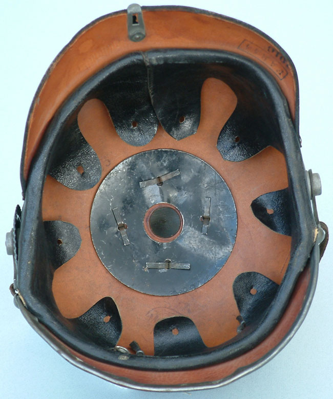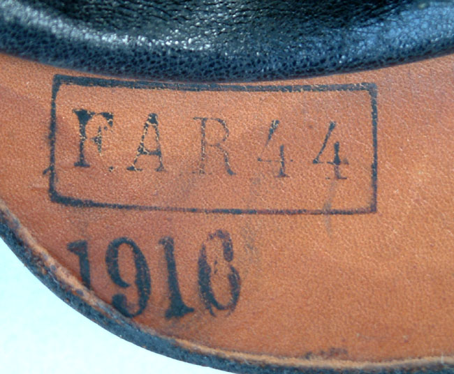 The helmet is unit marked "FAR 44 1916" on the rear visor. As on all Model 1915 helmets, the ball top is removable.