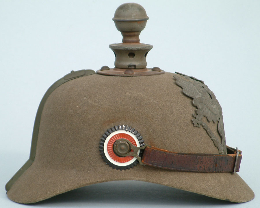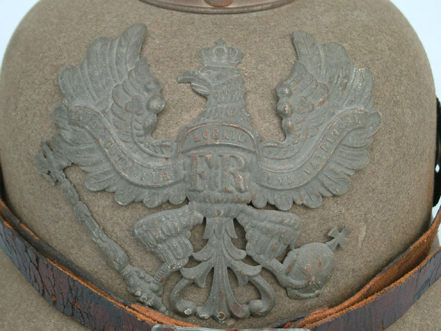 | A view of the side profile. This Pickelhaube has an interesting and attractive symmetrical profile. Note how well it has retained its shape due to the thick felt. | ||