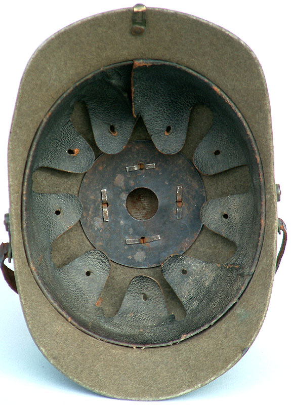 | The helmet was manufactured as a Model 1915 with Feldgrau steel fittings with a rear spine. Although this helmet does not have a front visor trim, it is made from the thick, heavy pattern of felt which makes it quite sturdy. As on all Model 1915 helmets, the ball top is removable. | ||