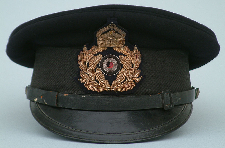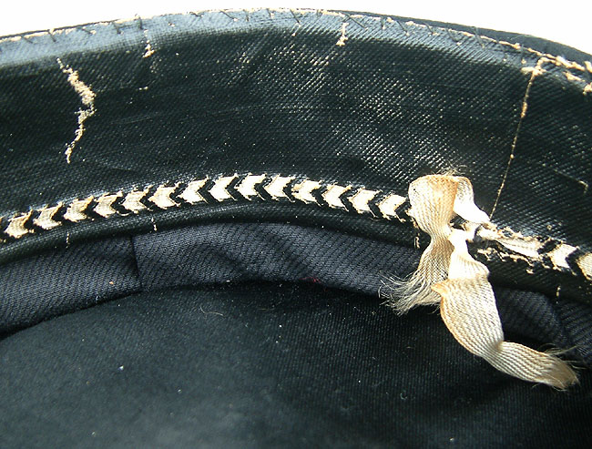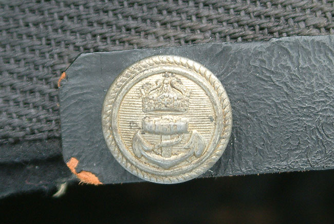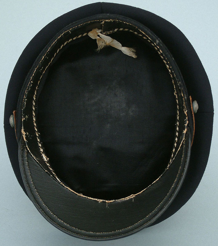 | Kaiserliche-Marine Seeoffizier Schirmmutze. The body is of a high quality doeskin wool, and constructed correctly for a naval cap with the stitched front visor. The course weave of the sweatband combined with a zinc chinstrap button indicates this is a wartime manufactured Schirmmütze. This Schirmmütze was worn by all commissioned Seeoffizier, from Leutnant Zur See to Admiral. | ||
