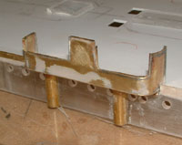 The Upper Deck Edging Like the hull and boat deck, brass angled-strip was carefully cut to fit the entire upper circumference of the upper deck to make the edge and soldered together at the seams. Unlike Deutschland and Hanover that had exposed Fore 8,8cm gun platforms, Pommern had both Fore gun platforms covered with a rather narrow "walk" which formed part of the upper deck. You can see these sticking out like wings on the Fore section of the deck. |