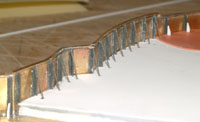 After holes were drilled all along the deck to accommodate the supports, piano wire was cut and glued into place. The wall looks large in this photo,