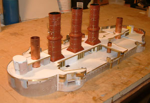 Finally! After 9 months of work I felt that I had finally completed the basic shape of the superstructure and was ready for some primer. I added the funnels to see how they would look. It is starting to look like Pommern! |
