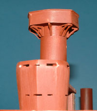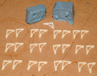 Supports Under both crow's nests were supports that were rather complicated, so one perfect master was built (the white one) and then a mould was made. Using the mould, 24 exact copies were cast. This photo shows the master, the mould, and the resin castings.