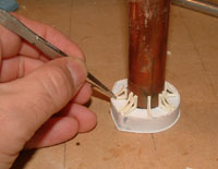 Gluing the Supports With the new supports cast, (and using my brain this time) the supports were glued on right-side-up. I used a spare piece of the copper pipe for the main masts secured to a flat surface to ensure they were spaced and vertical. |