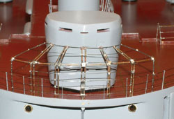 Railing Canvas To replicate the canvas along the railings I used silk paper cut into strips long enough to adhere on the bottom and roll over the top. First step, was to run a mix of white glue and water along the bottom edge of the canvas which becomes tacky in seconds. Period photos show that the canvas was attached below the railing, so the paper was laid along the upper outside edge below the railings and allowed to dry.