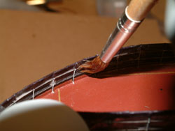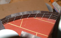 Forming the Canvas to the Railings Once the bottom was dry, the white glue and water mix was applied generously along the length being very carful not to go past the top of the railing. If you do (as I discovered) the paper above the railings will curl and become useless when it dries. And then (like me!) you get to tear it off and do it again.