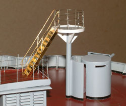 Aft Compass Platform Mounted The compass platform was made in the same fashion as the searchlight platforms, round plastic circle, plastic strip edging, with PLM Marinedetails' #82 Relingstütze (railing stanchions) with .007" music wire soldered to them. The Außenbordniedergang (outboard stairs) that I used on the Aft (rear) hull turned out to be a perfect fit and the correct angle. After the gangways fiasco, I needed something to go smoothly.
