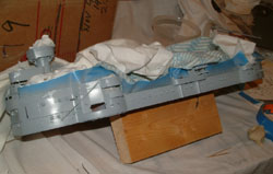 Repainting the Aufbau With all of the canvas on and the new doors and damage from re-working, the Aufbau (superstructure) had to be repainted. What was most important here, was to ensure that no paint got on the boat decks as that would ruin the dark red linoleum.