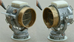 Painted Scheinwerfer These photos show one of the six Scheinwerfer after painting mounted onto the front funnel. I am quite pleased with the way these turned out considering what I had to start with.