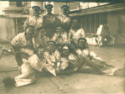 Ship's Crane Machinery For the machinery at the base of the crane, all I had was a single photo of some sailors on Pommern looking very grubby after coaling. There in the background, was the only image I had ever seen of the base of a Ship's Crane on Pommern. What was critical, is that unlike Deutschland and the other ships , there was a large flat ring around the base, and no visible serrated teeth.