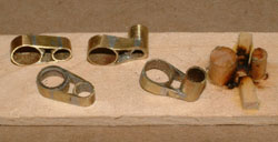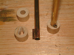 To make the large brackets that hold the masts sections together, I cut brass tube larger than the two sections, and soldered them together in a jig. Without a jig, I never would have been able to solder these all identically; and they had to be identical, as even the slightest variation and the mast would not be perfectly vertical and true.