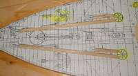 After trying several times to draw the chain runs, I gave up and cut templates from a photocopy of the SMS Deutschland drawings by R.M.A. Plankammer. The chain runs were cut from veneer and laid in position, then given the same treatment as the deck: sanding, cleaning, lacquer, light sanding, cleaning, and re-coated.
