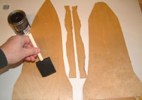 Sealing the Deck I left the newly-cut deck alone for a month while I finished a course at university, and when I checked them again I saw that the fore and aft sections had buckled and warped. No problem; I steamed the deck sections and secured them to plywood to dry. Once they had completely dried and were flat again, they had to be sealed to prevent them from warping again, so I gave both sides (and the edges) several coats of varnish. The two smaller pieces, are the sections that run along the sides between the fore and aft sections.