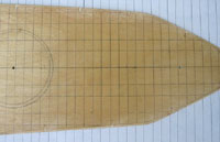 The Outside Header Planks Photographs of the deck show that the outside planks that formed the water gutter along the edge of the deck called 'header planks' were clearly wider and longer than the deck planks, so header planks 74mm long and 3mm wide were cut using a new jig. These were then glued onto the deck with THIN cyanoacrylate (super glue). I was very pleased with how well they adhered to my lacquered deck.