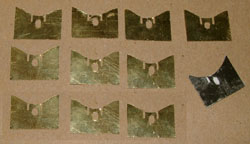 Shields Cut Here are the ten brass shields cut, drilled, and sanded into the correct shape. The plastic template used to shape them is the one on the right.