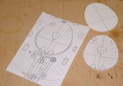 The Template Naturally, the Pommern Geschützeturme were not square, not round (that would have been too easy). They were an oval shape with various angles; nothing was straight or simple. The easiest way to make sure it was correct was cut templates from copies of the plans. Then the top and bottom of the Geschützeturm plans were glued to 3mm styrene plastic and cut to shape.