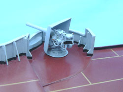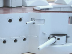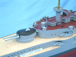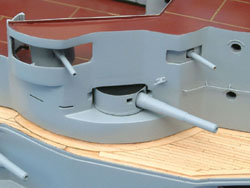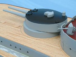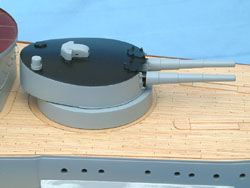 Here are several views of the painted Geschützen (guns). Now Pommern has teeth: she looks like a battleship. The tops of the 28cm Geschützeturme (gun turrets) were painted black on Kaiserliche-Marine warships, and it is believed that the only after the Seeschlacht am Skagerrak (battle of Jutland) 31 May-01 June, that the turrets received white circles painted on top for aerial identification. As Pommern was lost with all hands in this battle, no white circles were painted on the tops of the 28cm Geschützeturme (gun turrets). The hull requires some work, as I did not make the vision slits on both sides of the 17cm SK L/40 Kasematten (casemates) that you can see on the Aufbau (superstructure). So these will have to be added to the hull and that will require re-painting. Not a big deal, as there is enough re-work required that it will require re-painting regardless.