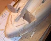 removed so much material that it ended up going straight through the hull. So be it. I removed those sections and glued in some pine block that I could carve to obtain the correct shape.