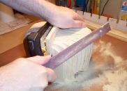 Taking Away the "Edge" As the planks have to lay flat on the hull stations, I discovered that I had to sand the stations down to obtain a correct "bevel" for the planks to lay flat. It is very easy to go too far in this step, so it is better to sand a little, check it, and then sand more as required. |