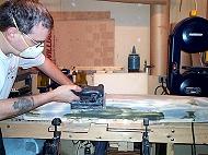 Rough Sanding The auto body filler was then sanded with 100-grade sandpaper on an electric sander. It's important to wear a mask to prevent the inhalation of glass fibers from the auto body filler. |