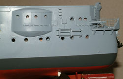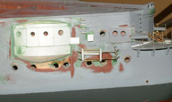 New Stern Sponsons Once I pried off the old Sponsons, the new Sponsons were glued on. I then layered them with sheet styrene to reflect the sharp edges and protruding doors on the actual ship. Each Sponson received holes for two large portholes on each side and two smaller portholes in the centre. Other details were added to each side, such as the small door against the Sponson for the 8,8cm barrel, door hinges, a ladder, and the the Nachtrettung ( Night rescue equipment). I also sharpened the edges on the rear 8,8cm doors. |