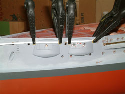 New Bow Sponsons Now that the stern Sponsons were accurate, the bow ones looked awful, so they were completely reworked by layering with styrene plastic like the stern ones. Here is the first top strip going on. |