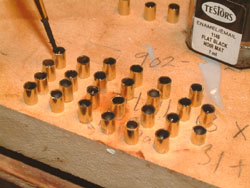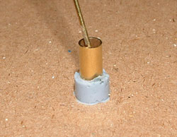 Bullauge The problem (besides no hardener that one time!) is that the resin was not sitting flat on the plug, and there were air bubbles. The resin sets very quickly, so I experimented and found that by only making 10 to 15 at a time the resin was more liquid. For each one, I placed a small drop of resin on the flat part of the plug first, then placed the brass tube on the plug, then filled it with resin. I then used a small piece of brass wire to stir the resin in each porthole to make sure the bubbles were out and all of the flat part of the silicone plug had resin on it. Using this method, I ended up with a 90% success rate. Out of 15, I would get 12 or 13 perfect, flat clear Bullauge.