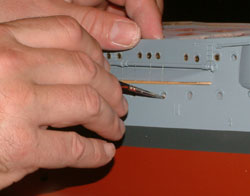 Applying Paint Rather than use glue, I used a trick my friend Friedhelm Wahl told me about; he suggested using paint, as that would hold the portholes in, and hide some of the tiny chips to the paint around the hole which resulted from the filing.