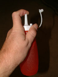 Ketchup Please A problem I had encountered when casting parts previously, was that the big jugs of resin were very difficult to pour from, and I always ended up with too much resin. So I went and bought a ketchup and mustard container for the grand total of $1.00, and poured resin mix in each one. Now I was able to put my finger over the hole to give it a good shake prior to pouring.