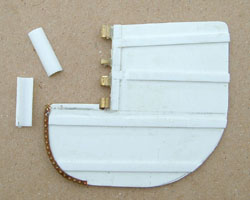Rudder Round 2 Like the first rudder, I cut a piece of 1mm styrene into the unique shape of Pommern's rudder, then added the four bases for the ribs. The four hinges were cut on the Proxxon saw out of 3mm brass tube and glued on and a section of 5mm plastic tube was cut in half for the massive back of the hinges. The riveted metal leading edge that the photo shows, was added using my friend Peter Lienau's 'rivet strips'. |