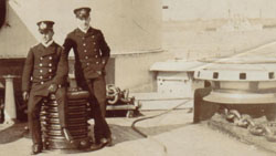 This wonderful photo of two officers on Schleswig-Holstein sitting on the Verholspill (double barrel capstan) used for handling heavy lines or cables, shows the Ankerspill (windlass) on the right.