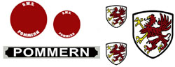 Decals I made the Pommern name plate, Griffin shields for the Bugzier (bow ornament) and Heckwappen (stern ornament), and the life preserver rings (two sizes) in Photoshop, and printed them on our Canon Pixima IP600D photo printer onto Experts Choice white decal sheet (item 120) for an ink-jet printer.