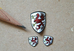 Griffin Shields Finally I arrived at the final step; to make the three griffin shields and mount them to the Bugzier and Heckwappen. You can see in this photo how tiny they are, but how nicely they turned out using decals.