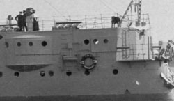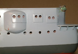 Not Even Close..... When compared to the photo above of Pommern's actual stern Sponsons, the Sponsons that I had made, looked like they were off a toy ship; too short, wrong shape, rounded edges, narrow doors, three large portholes (missing one porthole), flush rounded doors, ........I was also not happy with the shape of the rear 8,8cm (88mm gun) doors and there was a panel with two portholes that should not be there. So obviously this all had to be redone. |