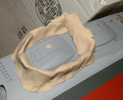 A Shortcut The bow Sponsons had the correct long shape, so rather than go through the carving process again, I cast the two bow Sponsons (left and right) right on the hull. Lazy, but effective. |