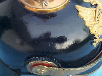 The cracking of the surface lacquer is known as "crazing" and is a result of old age. The original surface covering on spiked helmets was lacquer which being a derivative of the Lac bug is amazingly flexible. Poor storage, however, over many decades places the helmet at the mercy of the humidity rising and falling according to the season and temperature. This results in the leather shell expanding or shrinking accordingly. Years of this is reflected in the crazing of the lacquered finish on the surface. Obviously the only way to control this damaging action is to store the artifact in a stabilized environment.
