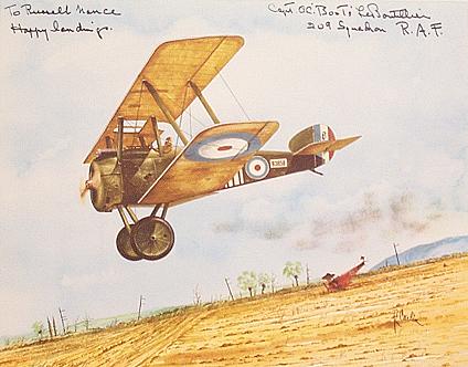 FOOTNOTE: Although the artist of the print, Robert E. Carlin correctly depicted Captain LeBoutillier flying over the scene of a crashed Manfred von Richthofen, he erred in his research and painted the aircraft as Camel B3858, which was actually the Camel flown on 21 April 1918 by his wingman, Lt. Foster. The Log Record of 209 Squadron RAF show that Captain LeBoutillier flew Sopwith F1 (Camel) D3338. In later years, when "Boots" wrote the note that accompanied the fabric, believing the artist's research to be correct, it appears that he used the erred print as his reference and included a note with the fabric which states "Fabric from my Sopwith Camel, B3858". The elderly "Boots" can certainly be forgiven for not recalling an insignificant detail such as the aircraft number he flew on any given day. What is significant is that the fabric is from the actual Sopwith F1 he was flying on 21 April 1918 |